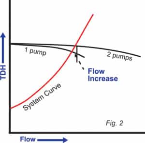 在任何給定的總動(dòng)態(tài)揚(yáng)程 (TDH) 下,并聯(lián)運(yùn)行的兩個(gè)相同的泵能夠產(chǎn)生兩倍于單個(gè)泵的流量。然而,系統(tǒng)中實(shí)現(xiàn)的實(shí)際流量取決于系統(tǒng)曲線與泵曲線的交點(diǎn)。除非系統(tǒng)曲線是可變的,否則流量增加可能不會(huì)那么顯著。