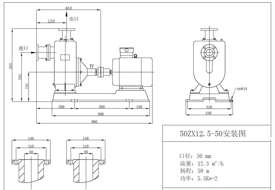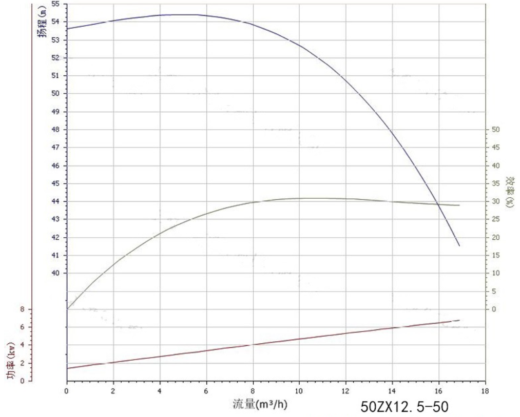 50ZX12.5-50自吸泵型號前面的50代表進(jìn)出口口徑為50mm、ZX表示為自吸式離心泵、12.5代表額定流量12.5立方米每小時、50表示泵的額定揚(yáng)程50米、自吸高度為5米,配用5.5KW功率電機(jī)。如果用戶要求吸程較高,還可以加裝真空輔裝置,做成吸程可達(dá)9米的高吸程自吸泵。應(yīng)當(dāng)注意的是,因?yàn)樽晕脜?shù)是使用清水測試而得出的,但在使用中會因?yàn)檩斔徒橘|(zhì)的粘度及管道損耗等原因,導(dǎo)致實(shí)際使用中流量、壓力參數(shù)減小。所以在選型的時候應(yīng)當(dāng)留有一些余量,尤其在工況要求揚(yáng)程必須達(dá)到50米時,建議選大一個自吸泵型號,選擇50ZX15-60自吸離心泵使用。