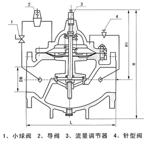 400X流量控制閥結(jié)構(gòu)圖( 1.球閥 2.導(dǎo)閥 3.流量調(diào)節(jié)閥 4.針閥) |