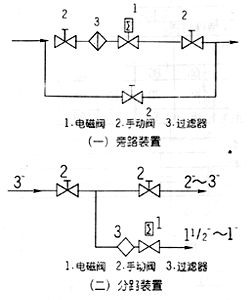 3、在電磁閥發(fā)生故障時(shí),為了及時(shí)隔離電磁閥,并保證系統(tǒng)正常運(yùn)行,最好安裝旁路裝置(如圖一)。
